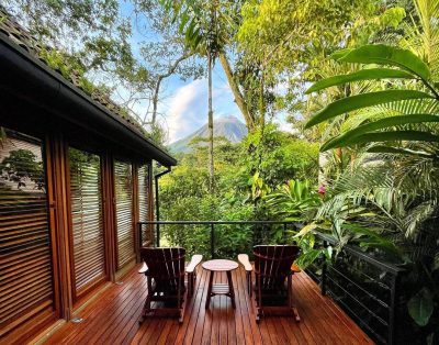 Las cómodas habitaciones ofrecen simplicidad, relajación y privacidad. Cada habitación en el resort de Volcano Lodge, Hotel & Thermal Experience goza de la privacidad de una terraza con vistas completas o parciales del majestuoso Volcán Arenal, los jardines botánicos, o ambos. Los muebles auténticos hechos de madera costarricense y pinturas o fotografías de artistas locales crean el perfecto escenario. 🛏️🖼️🌴