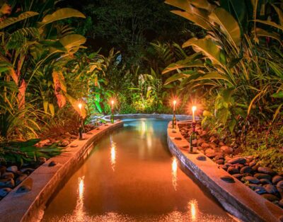Los baños termales de Volcano Lodge, Hotel & Thermal Experience son una exclusiva amenidad sólo para los huéspedes del hotel. Mientras te sumerges en las aguas termales ricas en minerales, te relajarás entre cascadas, exuberantes jardines botánicos tropicales y muy pocas personas. 🌸🏊♂️🌅